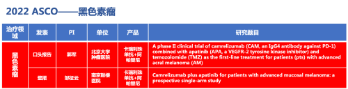 黑色素瘤领域的2篇研究摘要,采用918搏天堂自主研发的PD-1抑制剂卡瑞利珠单抗(艾瑞卡)联合阿帕替尼(艾坦)(“双艾”组合)的免疫联合抗血管(或再联合化疗)的治疗策略。