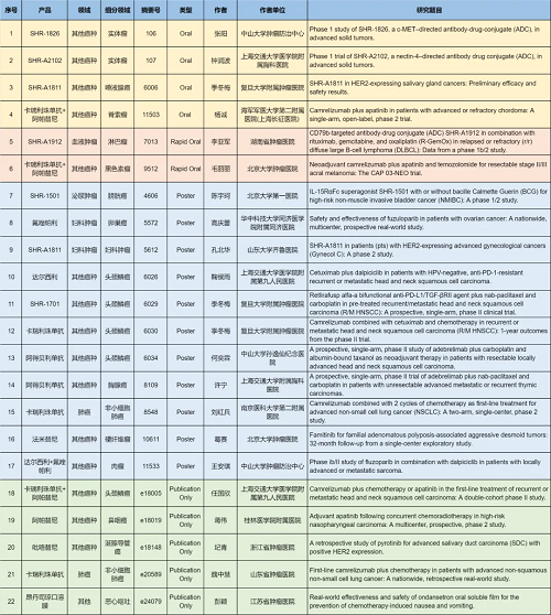 在肺癌、妇科肿瘤、淋巴瘤、膀胱癌、头颈肿瘤、黑色素瘤、肉瘤、鼻咽癌、脊索瘤、唾液腺癌、胸腺癌、硬纤维瘤、涎腺导管癌等其他多个疾病领域,卡瑞利珠单抗、阿帕替尼、阿得贝利单抗、吡咯替尼、达尔西利、氟唑帕利、法米替尼、SHR-1501、瑞拉芙普-α(SHR-1701)、SHR-1826、瑞康曲妥珠单抗(SHR-A1811)、SHR-A1912、SHR-A2102等抗肿瘤创新药相关研究一共入选了4项口头报告、2项快速口头报告、11项壁报展示和4项线上发表,彰显了918搏天堂强劲的研发实力。此外,昂丹司琼口溶膜在防治化疗导致的恶心呕吐方面展现出了良好的疗效,本次ASCO年会有1项研究线上发表。